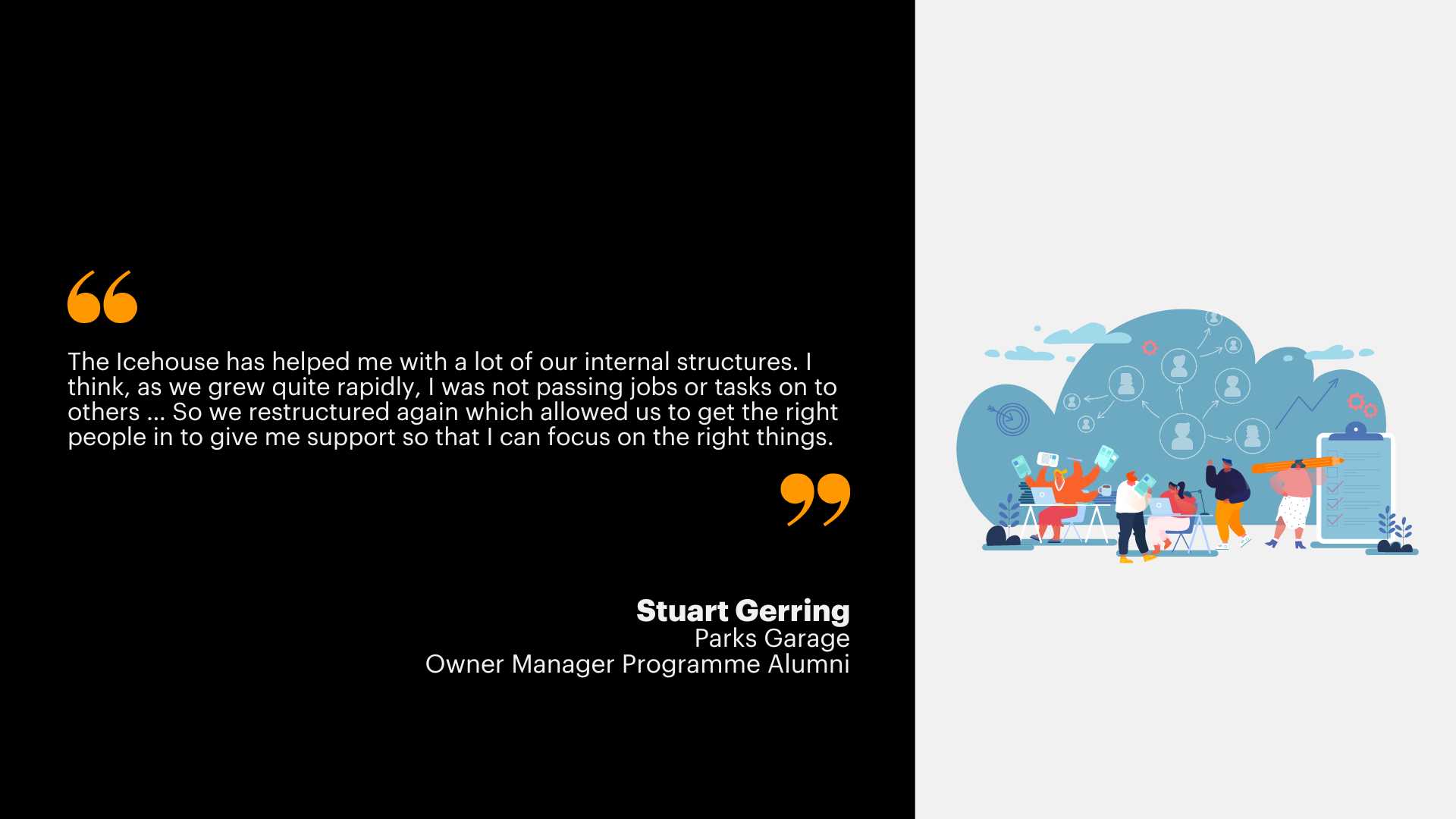“The Icehouse has helped me with a lot of our internal structures. I think, as we grew quite rapidly, I was not passing jobs or tasks on to others, and had people that were from the trade or from the industry coming off the tools to do a step up, but they were not really the perfect fit either… So we restructured again which allowed us to get the right people in to give me support so that I can focus on the right things,” says Stuart Gerring from Parks Garage and another OMP alumni.