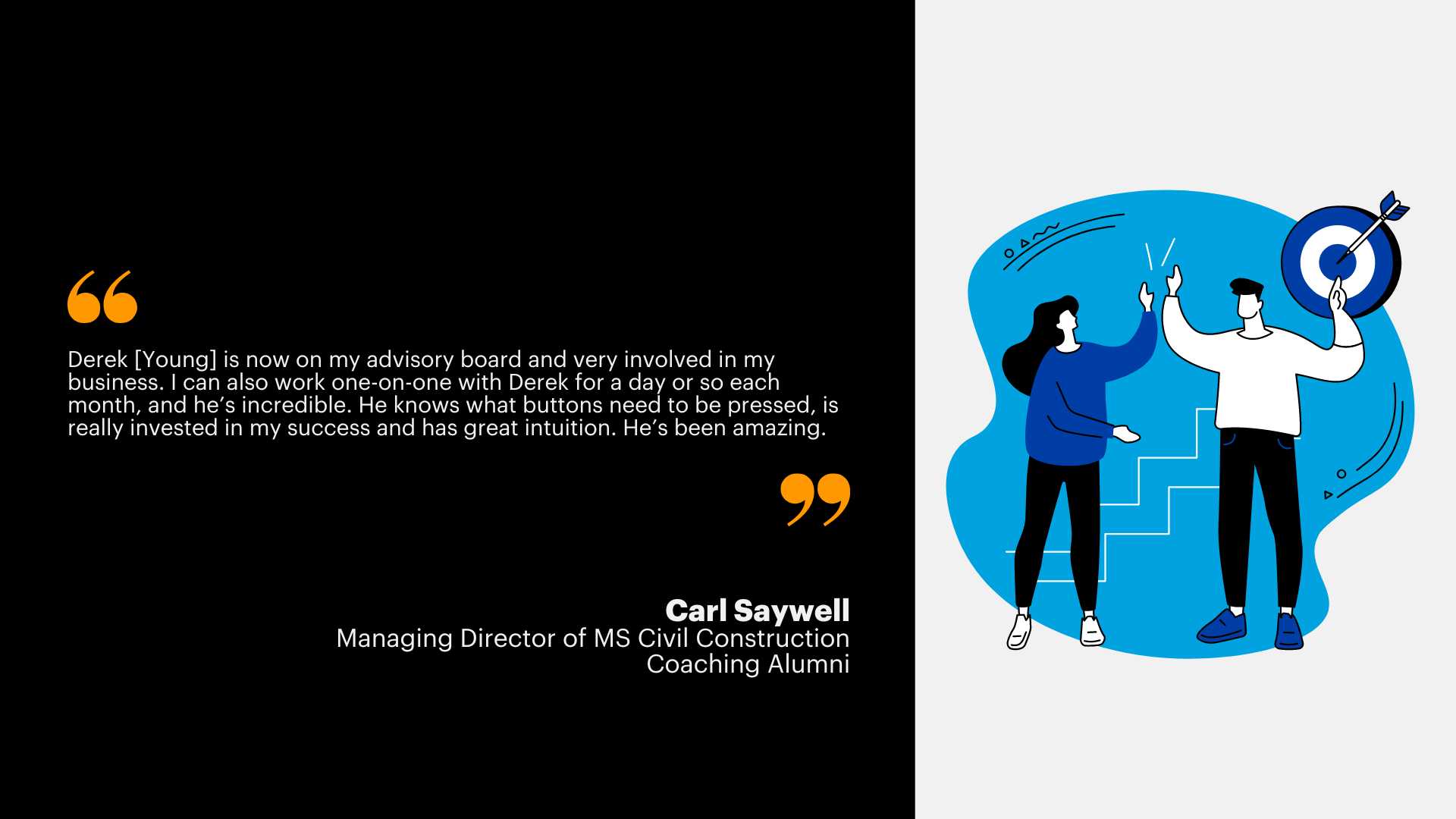 Carl Saywell, Managing Director of MS Civil Construction explains: “Derek [Young] is now on my advisory board and very involved in my business. I can also work one-on-one with Derek for a day or so each month, and he’s incredible. He knows what buttons need to be pressed, is really invested in my success and has great intuition. He’s been amazing.”