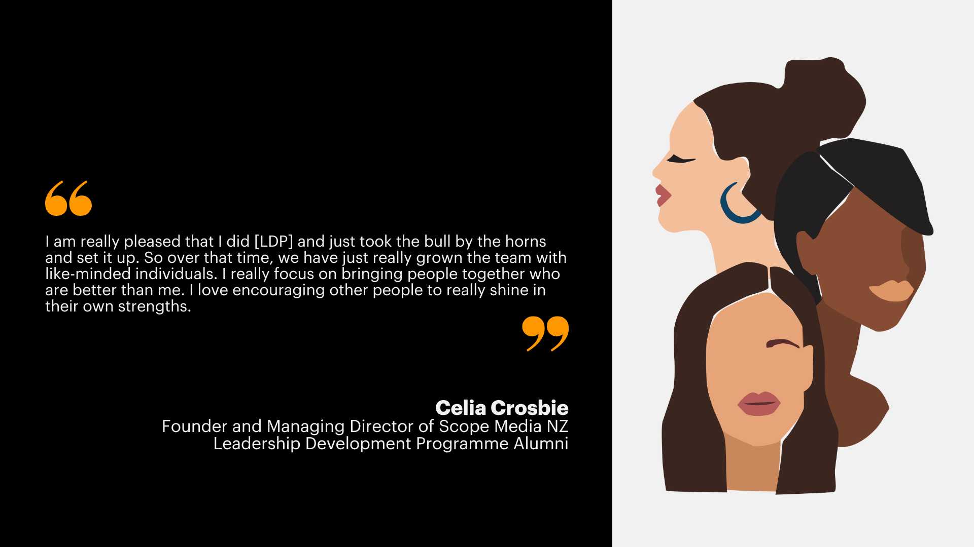 It can also help foster a more inclusive, stimulating and rewarding working environment, says Celia Crosbie, Founder and Managing Director of Scope Media NZ and an LDP alumni. “I am really pleased that I did [LDP] and just took the bull by the horns and set it up. So over that time, we have just really grown the team with like-minded individuals. I really focus on bringing people together who are better than me. I love encouraging other people to really shine in their own strengths.”